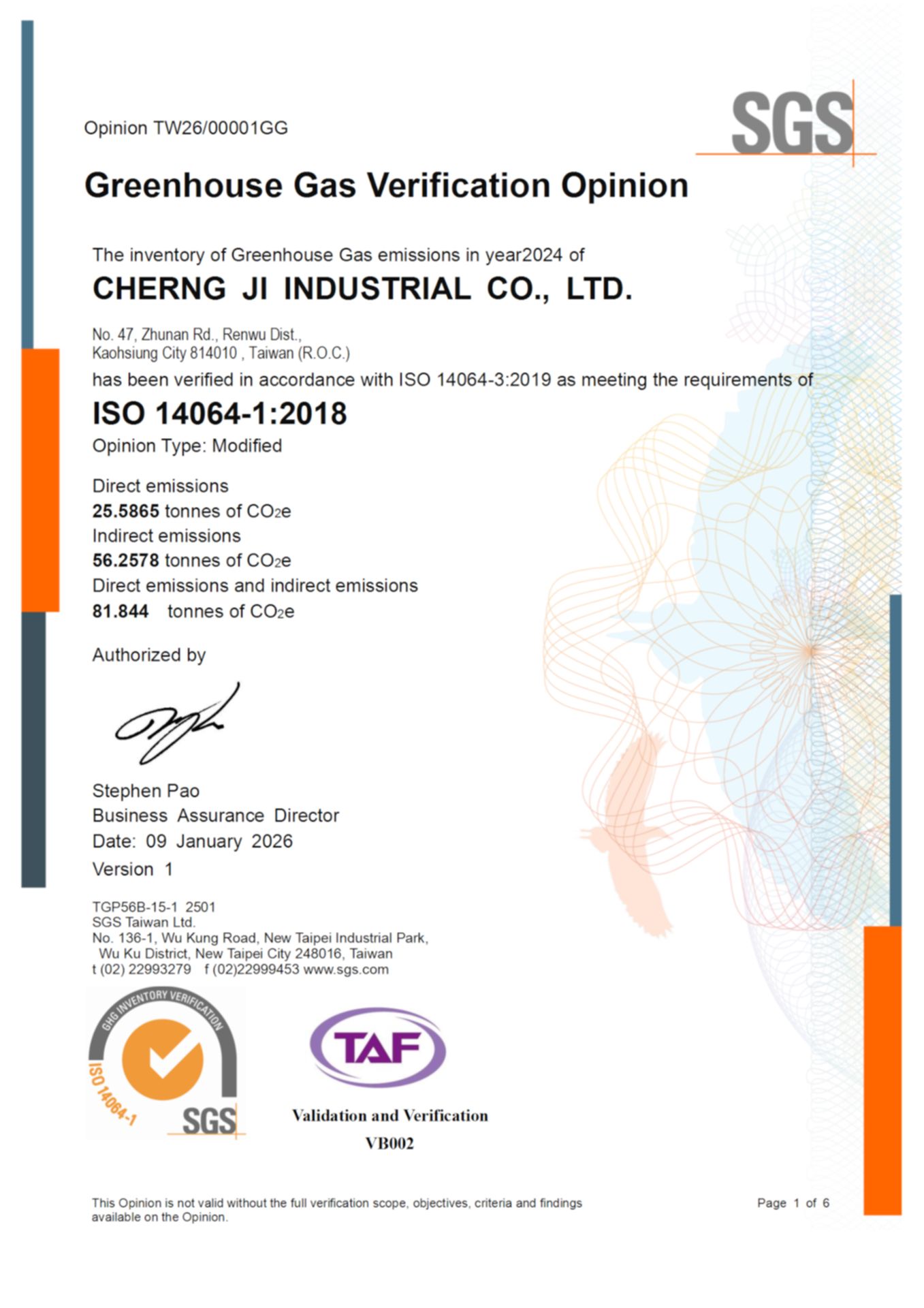 12 Jan, 2026After a period of preparation and dedicated effort, Cherng Ji Industrial Co., Ltd. is proud to announce that we have obtained the ISO 14064-1:2018 certification today. This milestone marks our entry into a new era starting in 2026, not only meeting the requirements of the EU CBAM (Carbon Border Adjustment Mechanism) regulations, but also representing our corporate responsibility in taking a solid step toward global greenhouse gas reduction and climate change mitigation goals.